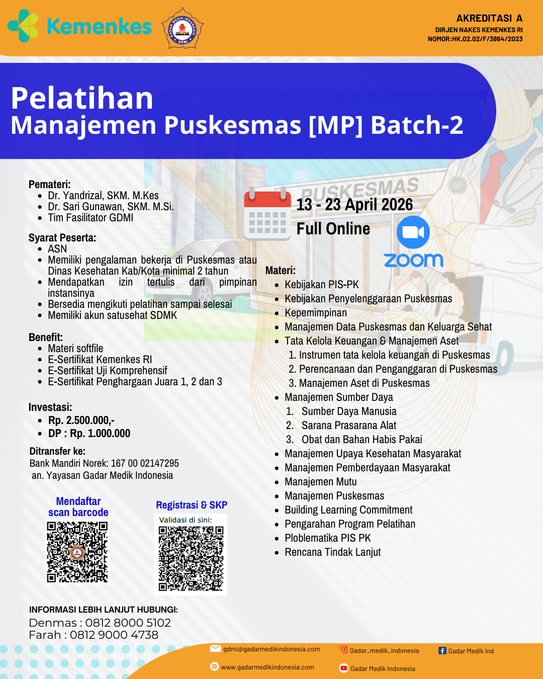 - Memiliki pengalaman bekerja di Puskesmas atau Dinas Kesehatan Kabupten/Kota minimal 2 tahun