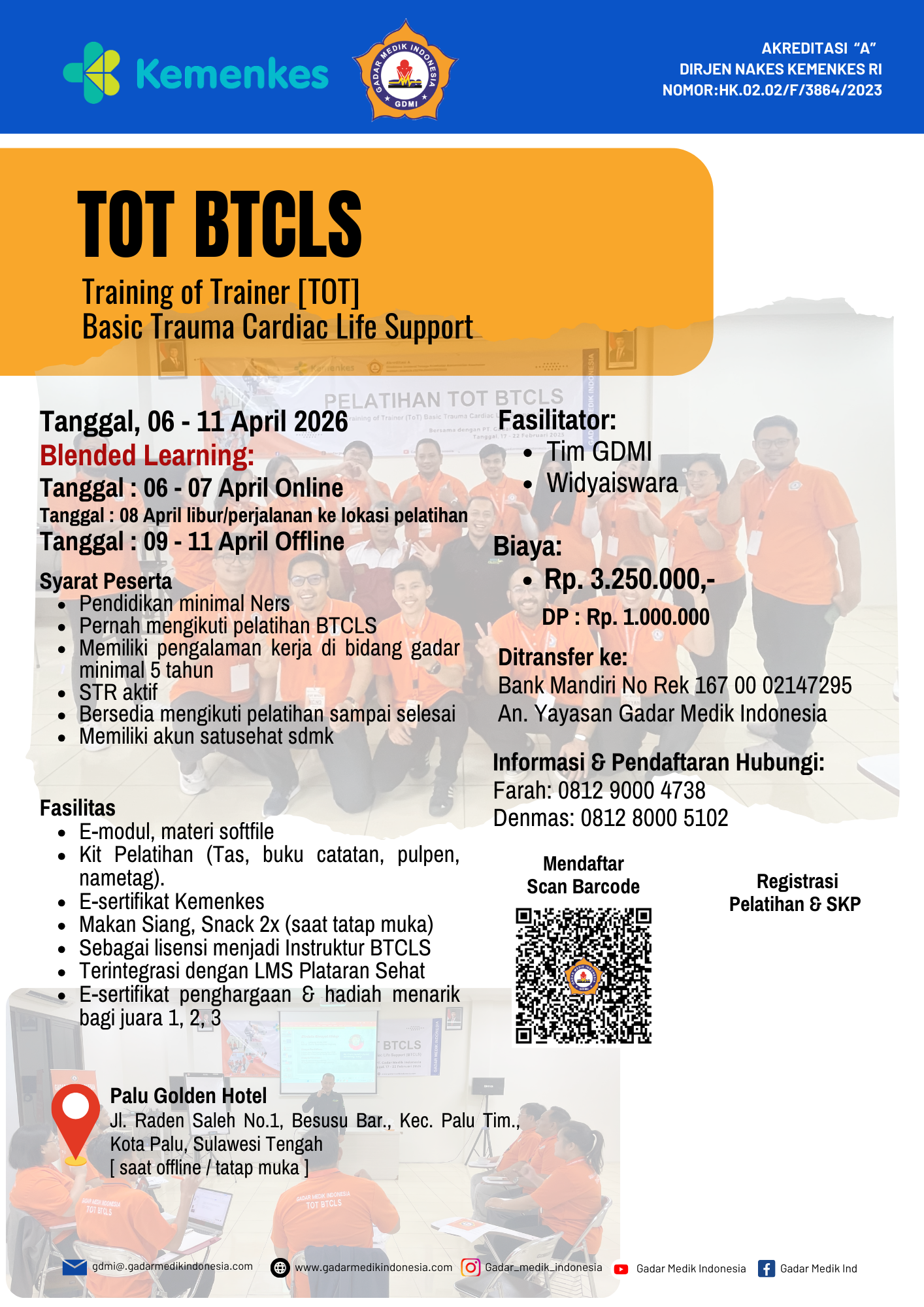 TOT BTCLS merupakan pelatihan bagi calon pelatih BTCLS. Dilaksanakan dengan Metode Pelatihan Blended Learning [2 hari Online, 3 hari Offline]